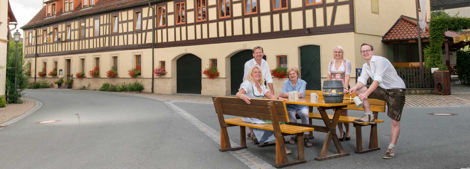 Seit nunmehr 150 Jahren verwöhnen wir, Ihre Familie Schmitt, im schönen Fachwerkdorf Mürsbach alle Durstigen mit exquisitem Bier aus der eigenen Brauerei – und alle Hungrigen mit bäuerlich ehrlicher fränkischer Küche.